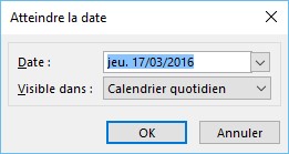 Pour accéder à une date éloignée, appuyez sur Ctrl + B ou cliquez sur le lanceur de boîte de dialogue Atteindre, sous l’onglet Accueil du ruban. Sélectionnez la date à atteindre et cliquez sur OK.