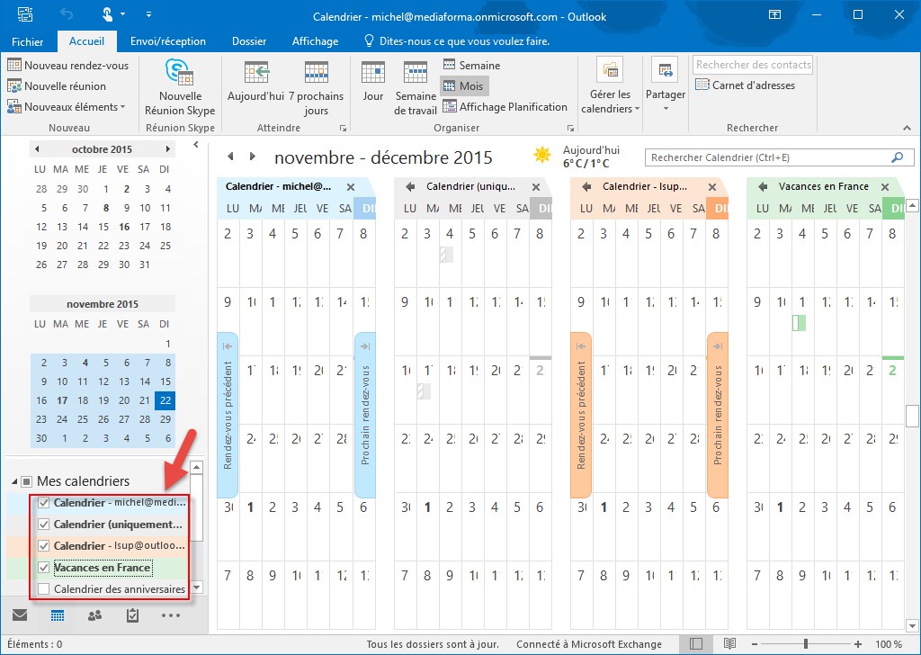 Avec Outlook 2016, il est possible d’afficher simultanément plusieurs calendriers. Basculez sur l’onglet Calendrier dans la barre de navigation, puis sélectionnez les calendriers à afficher dans le volet gauche, sous Mes calendriers. Le volet droit affiche alors les calendriers sélectionnés :