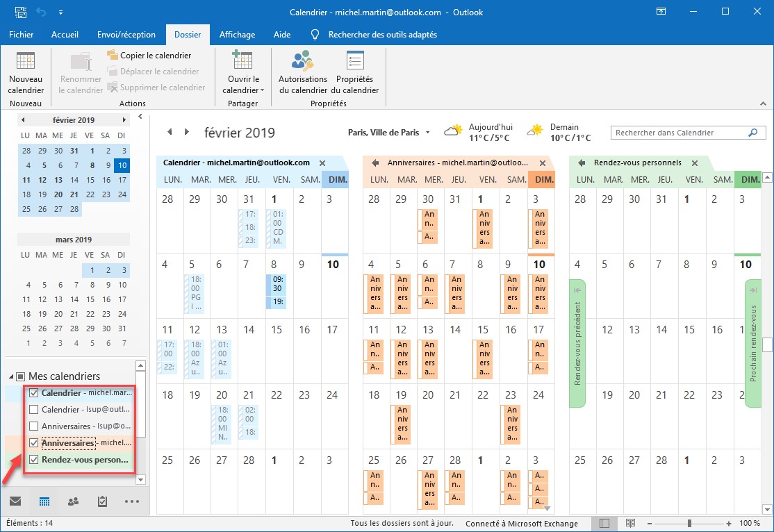 Basculez sur l’onglet Calendrier dans la barre de navigation, puis sélectionnez les calendriers à afficher dans le volet gauche, sous Mes calendriers. Le volet droit affiche alors les calendriers sélectionnés :