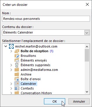 - Sélectionnez Calendrier dans la zone de liste Sélectionner l’emplacement de ce dossier.