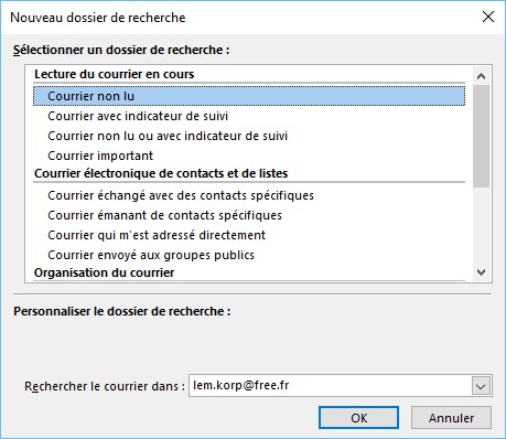 Les dossiers de recherche sont des dossiers virtuels destinés à filtrer vos e-mails. Pour créer un dossier de recherche, basculez sur l’onglet Dossier du ruban, puis cliquez sur l’icône Dossier de recherche du groupe Nouveau. La boîte de dialogue Nouveau dossier de recherche apparaît.