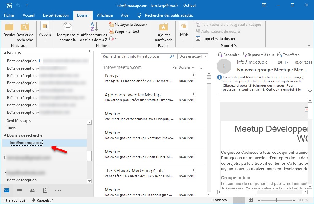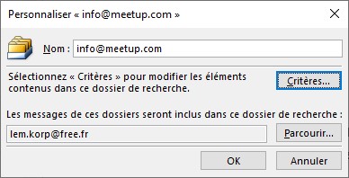 Voyons comment créer un dossier de recherche qui rassemble les e-mails envoyés par l’adresse info@meetup.com :