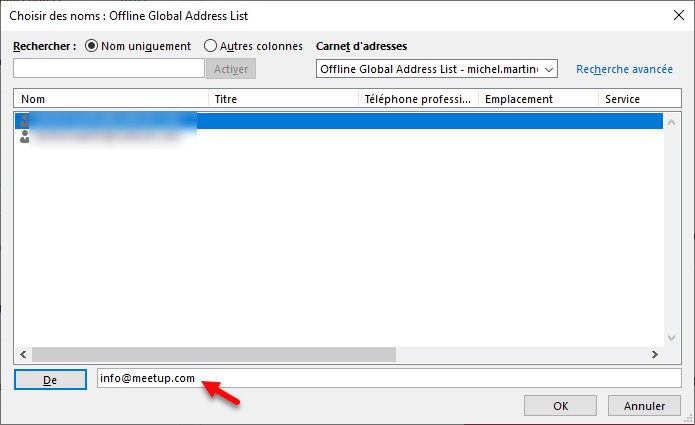 - Entrez l’adresse e-mail de la personne concernée dans la zone de texte Afficher le courrier provenant de ces contacts. Pour cela, cliquez sur Choisir, entrez l’adresse e-mail dans la zone de texte De, puis cliquez sur OK.
