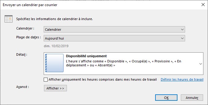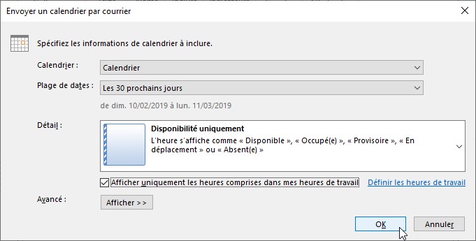 - Cochez la case Afficher uniquement les heures comprises dans mes heures de travail si vous voulez limiter le calendrier à vos heures de travail. Remarquez le lien, à droite de cette case, qui vous permet de définir précisément vos heures de travail.