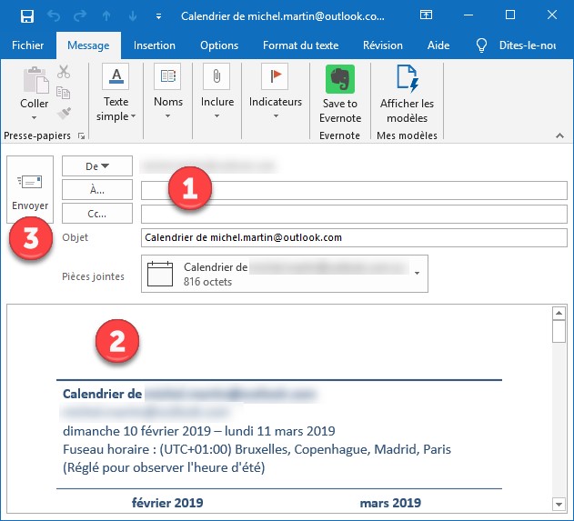 Il ne vous reste plus qu’à saisir l’adresse e-mail de votre destinataire dans le champ A (1), à taper quelques mots pour accompagner le calendrier (2) et à cliquer sur Envoyer (3) pour envoyer le message :