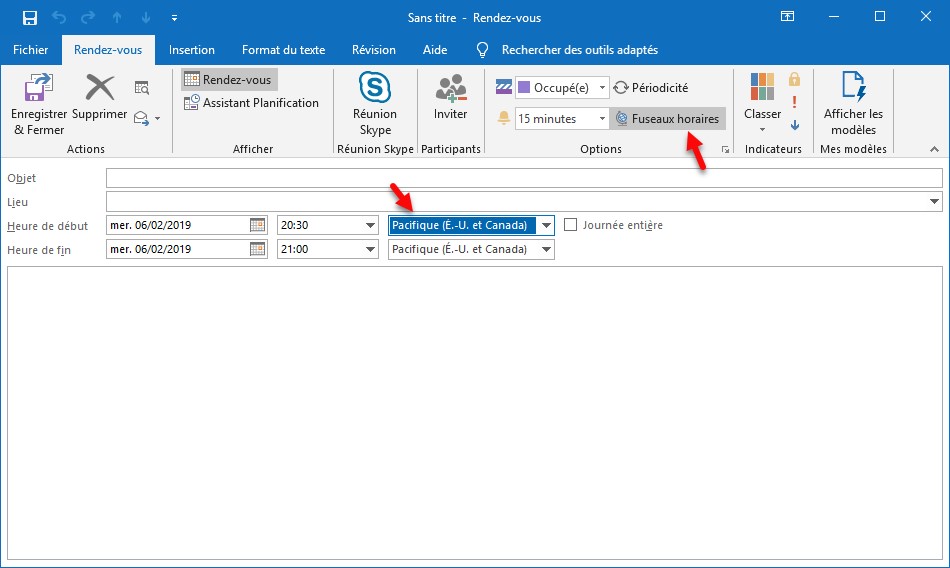 Vous pouvez modifier le fuseau horaire pour une réunion ou un rendez-vous sans pour autant affecter le fuseau horaire de l’horloge interne de l’ordinateur.
