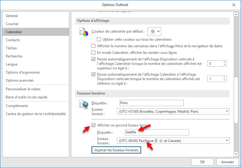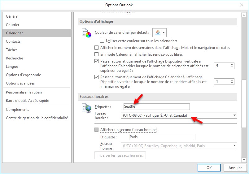 Si vous travaillez avec une entreprise située dans un autre fuseau horaire que le vôtre, vous allez pouvoir visualiser les deux fuseaux horaires dans le calendrier. Pour définir un deuxième fuseau horaire, basculez sur l’onglet Fichier du ruban puis cliquez sur Options. La boîte de dialogue Options Outlook s’affiche. Sélectionnez l’onglet Calendrier. Sous Fuseaux horaires, cochez la case Afficher un second fuseau horaire. Définissez le nom du second fuseau dans la zone de texte Etiquette et désignez le fuseau dans la liste déroulante Fuseau horaire. Validez en cliquant sur OK.
