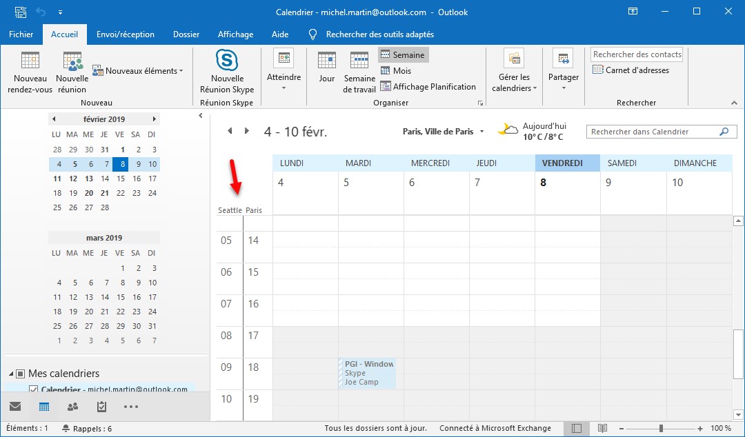 Les deux fuseaux horaires seront affichés en mode d’affichage Jour, Semaine de travail, Semaine ou Affichage Planification. Très pratique pour définir des rendez-vous ou des réunions :