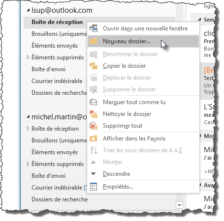 Pour créer un nouveau dossier, cliquez du bouton droit sur le dossier Boîte de réception dans le volet des dossiers et sélectionnez Nouveau dossier dans le menu.