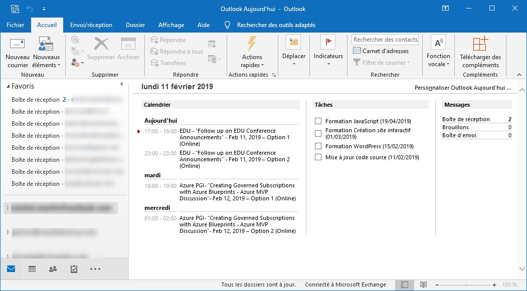 Dès son lancement, Outlook peut afficher une page d’accueil. Baptisée « Outlook Aujourd’hui », cette page synthétise toutes les informations du jour : derniers messages arrivés, prochains rendez-vous, tâches à effectuer, etc.