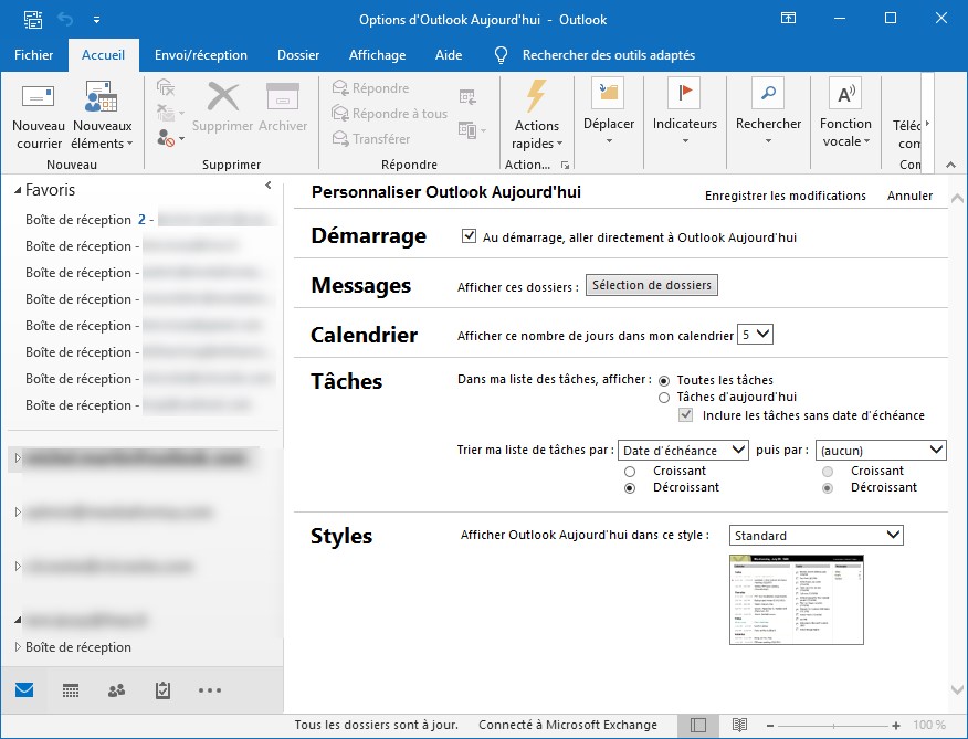 Pour personnaliser la page Outlook Aujourd’hui, cliquer sur Personnaliser Outlook Aujourd’hui, dans l’angle supérieur droit de la fenêtre. Cochez la case Au démarrage, aller directement à Outlook aujourd’hui pour afficher automatiquement cette page dès l’ouverture d’Outlook. Vous pouvez également choisir les dossiers à afficher dans Outlook Aujourd’hui, le nombre de jours pris en compte dans le module Calendrier, les tâches à afficher et le style d’affichage.