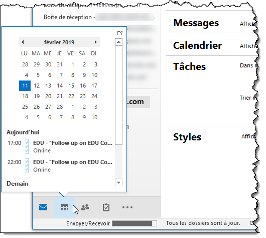 A titre d’information, vous pouvez à tout moment avoir un aperçu de votre calendrier et de vos tâches en pointant le libellé correspondant dans la barre de navigation.