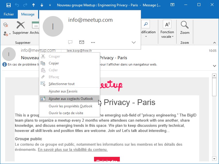 Pour ajouter un contact dans le module Contacts, ouvrez un message e-mail envoyé par la personne que vous voulez référencer. Cliquez du bouton droit sur le champ De, c’est-à-dire sur l’adresse e-mail de votre correspondant, et sélectionnez Ajouter aux contacts Outlook dans le menu.