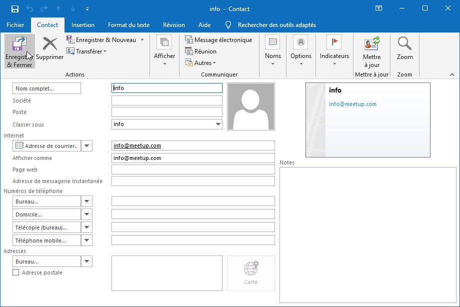 La fenêtre Contact s’affiche. Saisissez toute autre information qui vous parait utile, cliquez sur Enregistrer et fermer, puis fermez la fenêtre Contact.