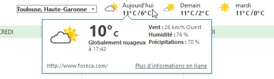Si les informations affichées ne sont pas suffisantes, cliquez sur Plus d’informations en ligne. Votre navigateur par défaut s’ouvre et le service météo de MSN y affiche des prévisions bien plus détaillées.