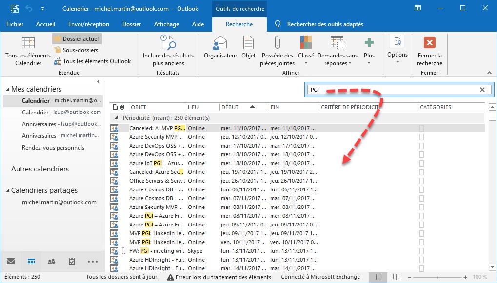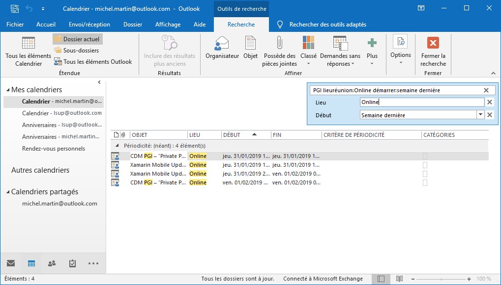 La zone de texte Rechercher dans Calendrier permet de trouver des informations textuelles dans un calendrier. Lorsque vous tapez un ou plusieurs mots dans la zone de recherche, l’affichage est filtré pour donner accès aux occurrences du terme recherché.