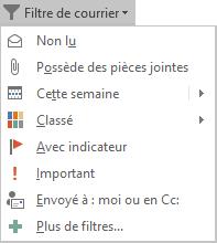 Pour limiter le nombre d’e-mails affichés, vous pouvez utiliser la fonctionnalité Filtre de courrier d’Outlook. Sous l’onglet Accueil, dans le groupe Rechercher, cliquez sur l’icône Filtre de courrier et choisissez un filtre dans le menu. Vous pourriez, par exemple, limiter l’affichage aux e-mails :