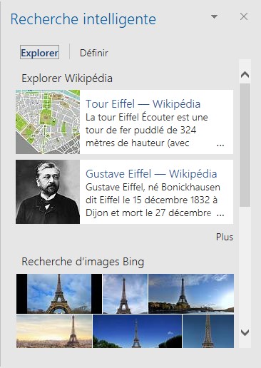 Outlook 2019 permet d’effectuer des recherches dans Bing sans ouvrir votre navigateur Web. Supposons par exemple que vous vouliez obtenir des informations sur la Tour Eiffel. Cliquez sur Recherche des outils adaptés, dans la partie droite du ruban, tapez tour eiffel et cliquez sur Recherche intelligente sur « tour eiffel ». Un panneau intitulé Recherche intelligente apparaît sur le côté droit de la fenêtre d’Outlook. Il donne accès aux résultats de recherche retournés par Bing sur le terme que vous avez tapé dans la zone Rechercher des outils adaptés :