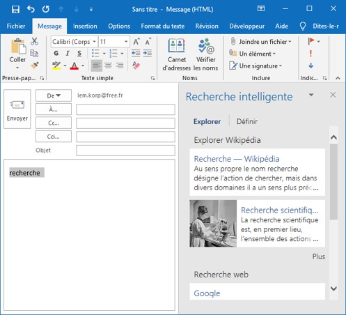 La recherche dans Bing peut également se faire à partir d’un texte présent dans une fenêtre de composition de message. Sélectionnez ce texte, cliquez du bouton droit sur la sélection et choisissez Recherche intelligente dans le menu contextuel. Cette action affiche les résultats d’une recherche Bing basée sur cette expression dans le volet Recherche intelligente :