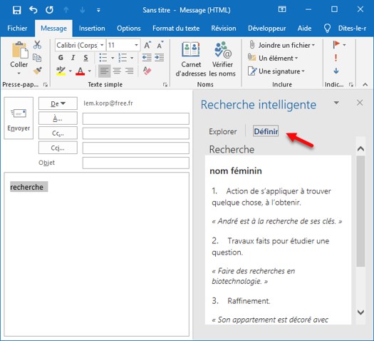 La recherche intelligente intègre une nouvelle fonctionnalité. Lorsque vous lancez une recherche intelligente sur un mot, vous pouvez basculer sur l’onglet Définir du volet Recherche intelligente pour avoir la ou les significations de ce mot. Ici par exemple, nous affichons les définitions du mot « recherche » :