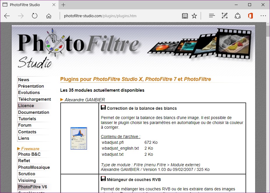 Vous avez vu dans cette formation qu’il était possible d’installer des plugins pour compléter les fonctions de base de PhotoFiltre. Tous les plugins n’ont pas été abordés. Si vous voulez en essayer d’autres, il vous suffit d’aller sur la page http://www.photofiltre-studio.com/plugins/plugins.htm :