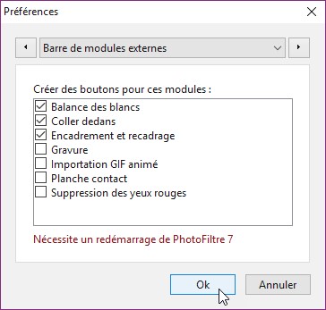 Si vous avez installé plusieurs plugins dans PhotoFiltre, vous pouvez faciliter leur accès en affichant la barre des modules. Dans un premier temps, lancez la commande Préférences dans le menu Outils. La boîte de dialogue Préférences s’affiche. Sélectionnez Barre de modules externes dans la liste déroulante supérieure et cochez les cases des modules que vous voulez rendre accessibles dans la barre des modules. Cliquez alors sur OK pour valider votre choix :