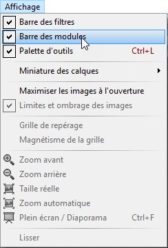 Fermez puis redémarrez PhotoFiltre. Lancez la commande Barre des modules dans le menu Affichage, de telle sorte qu’une marque de sélection s’affiche devant l’entrée Barre des modules :