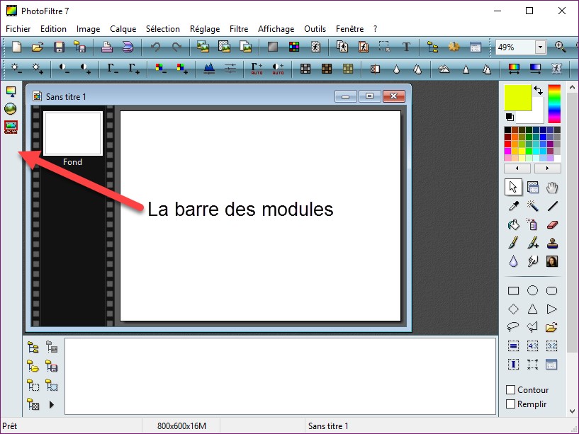 Créez une nouvelle image ou ouvrez une image existante. Comme vous pouvez le constater, les plugins sélectionnés dans la boîte de dialogue des préférences sont maintenant accessibles dans la barre des modules, affichée dans la partie gauche de la fenêtre :