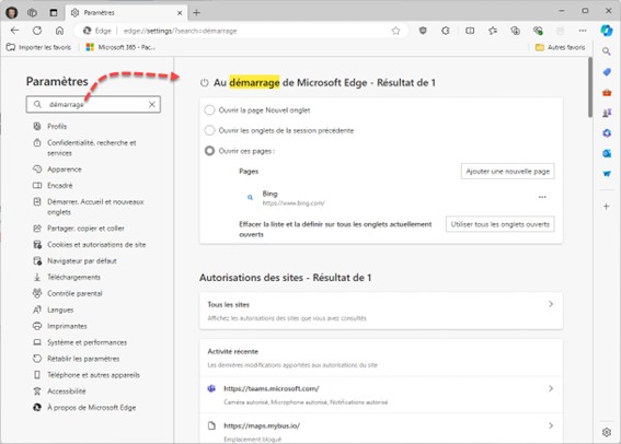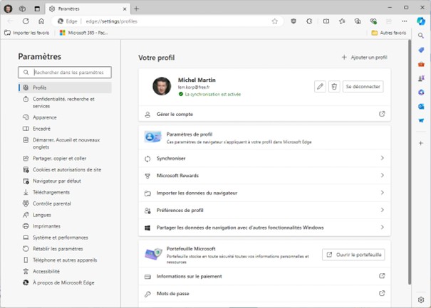 Pour accéder aux paramètres de Microsoft Edge, cliquez sur l’icône qui représente des points de suspension, dans l’angle supérieur droit de la fenêtre, puis cliquez sur Paramètres. Les paramètres sont accessibles via plusieurs onglets affichés dans le volet gauche :