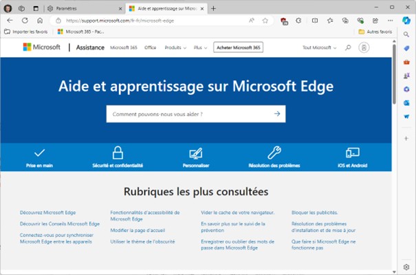 Pour avoir des informations sur les innombrables possibilités de votre navigateur Microsoft Edge, vous pouvez aussi appuyer sur la touche de fonction F1. Un onglet secondaire s’ouvre. Naviguez dans les rubriques proposées ou posez votre question dans la zone de texte Comment pouvons-nous vous aider :