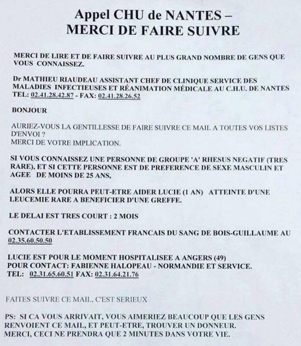 Il y a quelques semaines, une « amie » Facebook m’envoie un message privé qui me demande de faire suivre un message émanent du CHU de Nantes :