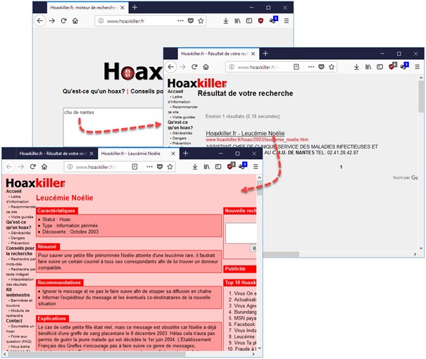Sur http://www.hoaxkiller.fr, il vous suffit d’entrer quelques mots pour trouver le ou les hoax correspondants. Cliquez sur les liens proposés pour connaître le détail du hoax :