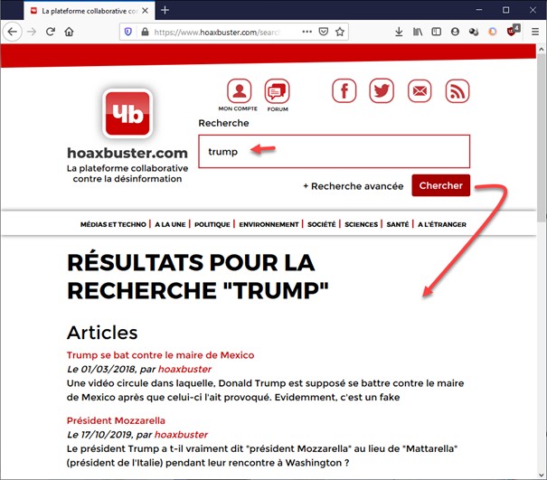 Sur https://www.hoaxbuster.com/, le principe est le même : entrez quelques mots dans la zone de texte Rechercher, puis cliquez sur Chercher. Si un ou plusieurs résultats sont trouvés, cliquez sur les liens correspondants pour avoir plus de détails :