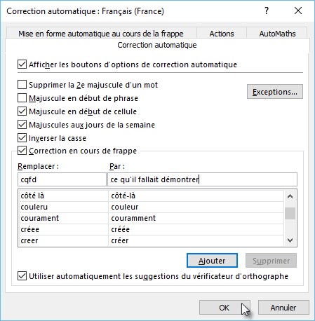 La partie inférieure de la boîte de dialogue affiche la liste des mots qui seront automatiquement corrigés pendant la frappe.
