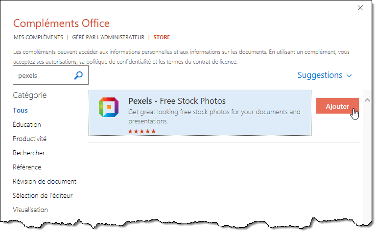 Basculez sur l’onglet Insertion dans le ruban, cliquez sur Mes compléments dans le groupe Compléments. Pour l’instant, aucun complément pour Office n’est installé. Cliquez sur Office Store. Tapez pexels dans la zone de recherche et appuyez sur la touche Entrée. Cliquez sur Ajouter, à droite du complément Pexels.