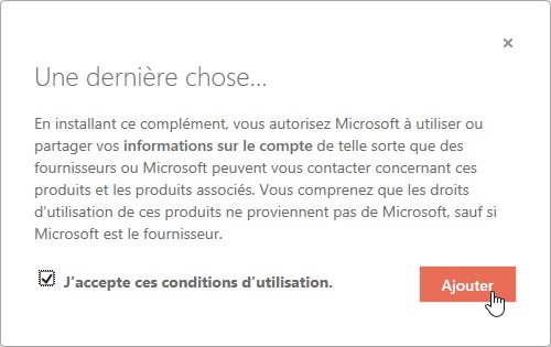 Une boîte de dialogue vous informe des conditions d’utilisation de ce complément. Cochez la case J’accepte ces conditions d’utilisation et cliquez sur Ajouter :