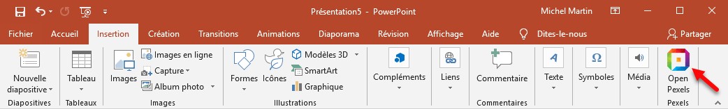 Quelques instants plus tard, l’icône du complément Pexels apparait à droite de l’onglet Insertion du ruban :