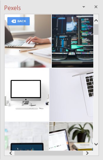 Cliquez sur cette icône. Le volet Pexels s’affiche dans la partie droite de la fenêtre. Indiquez ce que vous cherchez (en anglais) dans la zone de texte Search for free photos et appuyez sur la touche Entrée du clavier. Quelques instants plus tard, de nombreuses photos libres de droit sont à portée de souris :