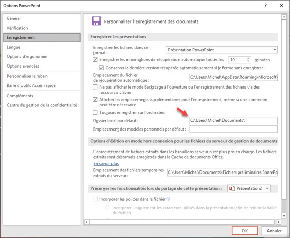 Si aucun dossier de travail n’est spécifié, PowerPoint utilise le dossier Documents par défaut. Ce dossier se trouve dans le dossier Users\utilisateur (où utilisateur représente le nom de l’utilisateur) du disque d’installation de Windows.