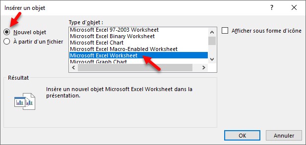 Il est parfois nécessaire d’utiliser des tableaux plus complexes que ceux qui peuvent être définis dans PowerPoint. Dans ce cas, vous mettrez à contribution votre tableur Excel. Sélectionnez l’onglet Insertion dans le ruban, puis cliquez sur l’icône Objet dans le groupe Texte. Cette commande affiche la boîte de dialogue Insérer un objet. Sélectionnez l’option Nouvel objet, choisissez Microsoft Excel Worksheet dans la zone de liste Type d’objet :
