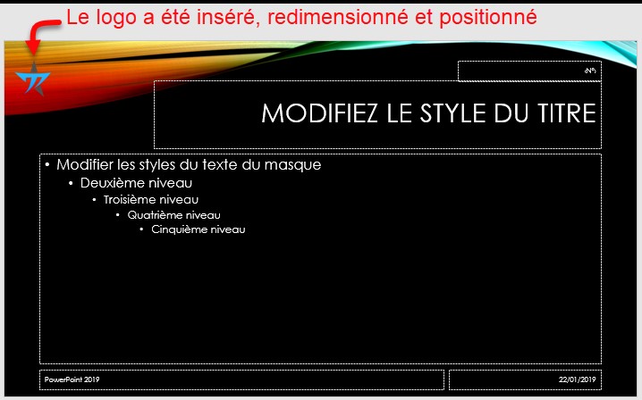 Vous pouvez inclure un logo d’entreprise (ou tout autre objet graphique) sur l’arrière-plan de chaque diapositive. Pour cela, vous devez modifier le masque des diapositives. Sélectionnez l’onglet Affichage dans le ruban, puis cliquez sur l’icône Masque des diapositives dans le groupe Modes Masque. Dans le volet gauche, cliquez sur le masque principal des diapositives, c’est-à-dire sur le premier masque. Sélectionnez l’onglet Insertion dans le ruban, cliquez sur l’icône Images dans le groupe Images et choisissez l’image à insérer. Repositionnez et redimensionnez l’image.