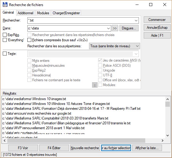 Appuyez simultanément sur les touches Alt et F7. La boîte de dialogue Recherche de fichiers s’affiche. Indiquez le type des fichiers concernés dans la zone de texte Rechercher, cochez la case Texte et entrez le texte recherché dans la zone de texte en face de la case Texte. Cliquez enfin sur Commencer pour commencer la recherche. Les fichiers correspondants sont listés dans la partie inférieure de la boîte de dialogue. Double-cliquez sur l’un d’entre eux pour l’afficher dans Total Commander, puis double-cliquez sur son nom pour l’ouvrir.