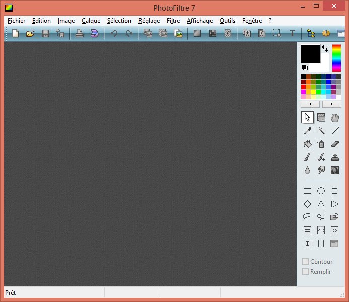 La fenêtre de PhotoFiltre est très classique. Elle est composée d’un système de menus, d’une barre d’outils, d’une palette d’outils, d’une barre d’état et d’une zone de travail centrale.