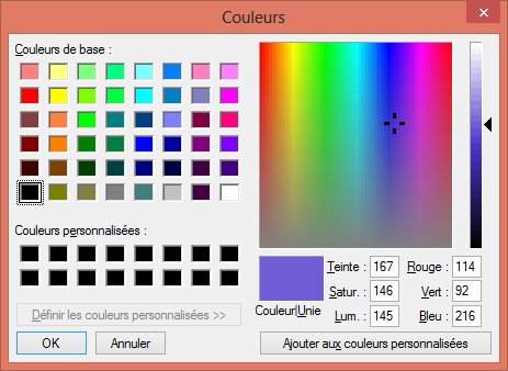 Enfin, vous pouvez également cliquer sur les carrés qui représentent les deux boutons de la souris pour accéder à un nuancier donnant accès à 16 millions de couleurs. Choisissez une couleur dans le nuancier et ajustez la quantité de blanc ou de noir dans la couleur en ajustant le curseur. Si vous les connaissez, vous pouvez également entrer la teinte, la saturation et la luminance de la couleur ou ses composantes Rouge, Vert et Bleu. Enfin, pour retrouver facilement une couleur, vous pouvez la mémoriser dans la palette de couleurs personnalisées en cliquant sur Ajouter aux couleurs personnalisées.