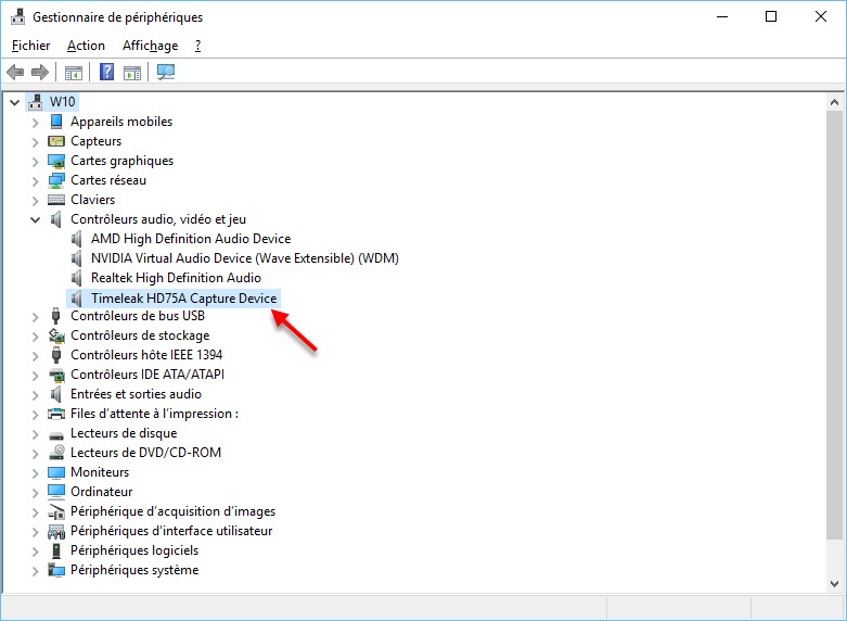 Chez vous, elle aura certainement un autre nom. Cliquez du bouton droit sur son intitulé et choisissez Mettre à jour le pilote dans le menu contextuel. Cliquez sur Rechercher un pilote sur mon ordinateur et désignez l’emplacement où vous avez dézipé le pilote HD75A. Au bout de quelques instants, la carte d’acquisition devrait être représentée par l’intitulé Timeleak HD75A Capture Device.
