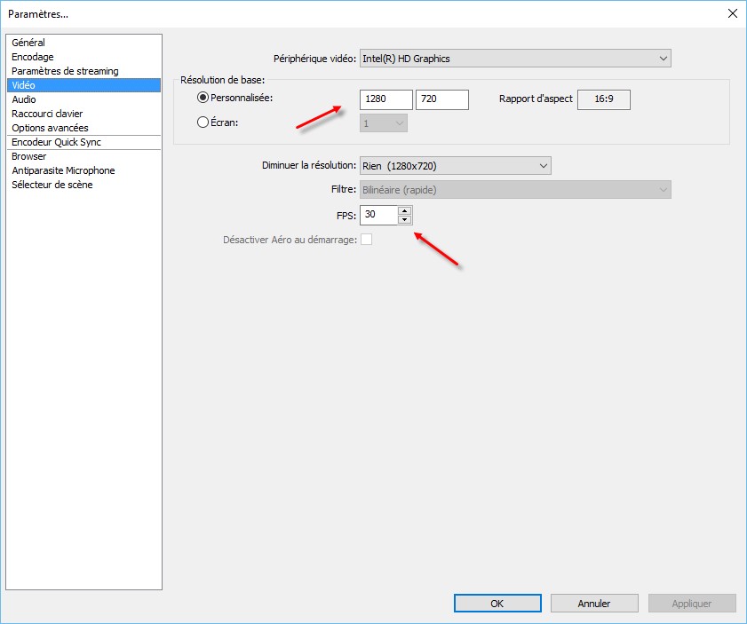 Sous l’onglet Vidéo, définissez la résolution de la capture et le nombre d’images par seconde :
