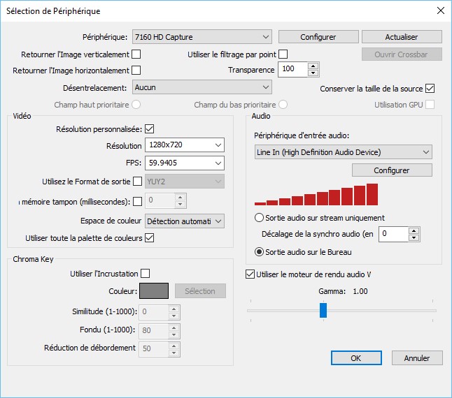 Avant de pouvoir capturer des vidéos sur le port HDMI de la carte, vous allez devoir la configurer. Lancez la commande Paramètres dans le menu Paramètres. La boîte de dialogue Paramètres s’affiche. Sous l’onglet Général, définissez la langue de l’interface : français. Sous l’onglet Encodage, définissez les paramètres de l’encodage vidéo et audio :