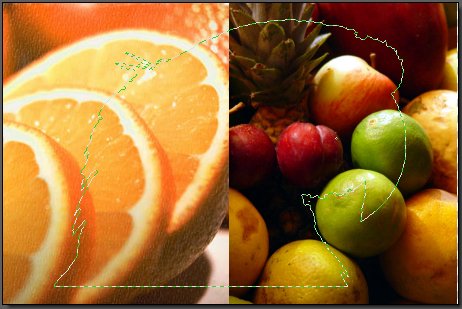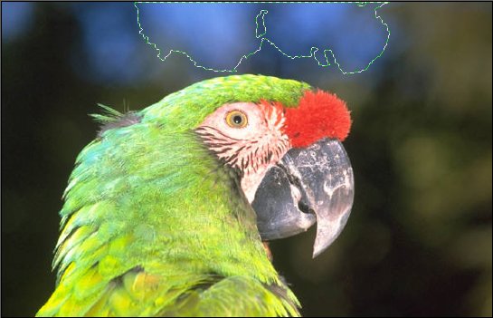 Sélectionnez l’outil Baguette magique dans la palette d’outils. Choisissez une tolérance de 100 dans la zone de texte Tolérance. Cliquez dans la zone qui entoure le perroquet. La sélection n’est pas aussi étendue que nous aurions pu l’espérer. Il va falloir la compléter en cliquant sur d’autres endroits dans l’arrière-plan.