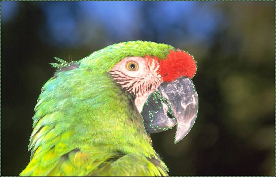 Affectez la valeur 50 au paramètre Tolérance. Maintenez la touche Alt du clavier enfoncée et cliquez sur les zones à exclure de la sélection. Lorsque le perroquet est bien détouré, lancez la commande Inverser dans le menu Sélection. Maintenant, le perroquet est détouré :