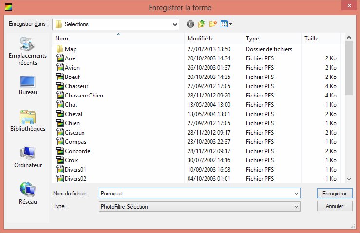 Il ne vous reste plus qu’à enregistrer la sélection dans le dossier Sélections de PhotoFiltre. Pour cela, lancez la commande Enregistrer la forme dans le menu Sélection. Le dossier Sélections est automatiquement choisi. Donnez un nom à la forme et validez en cliquant sur Enregistrer :
